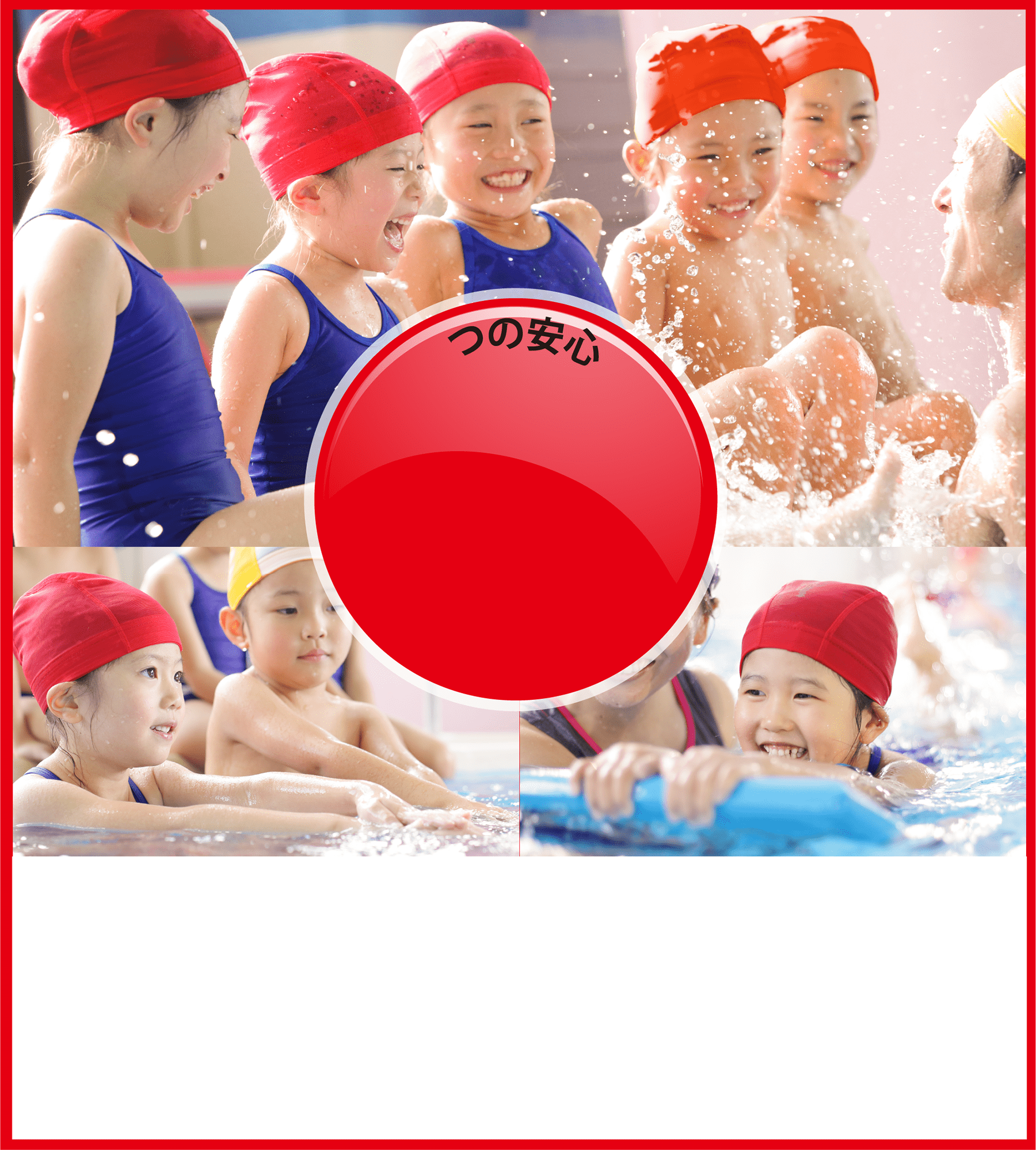 わたし達の中に泣く子を嫌がるコーチは一人もいません。不安でいっぱいになったお子様の心の中に入り込み、水を大好きになってもらい、体を動かす楽しさを知ってもらいます。はじめてのお子様も安心してお預けください。
